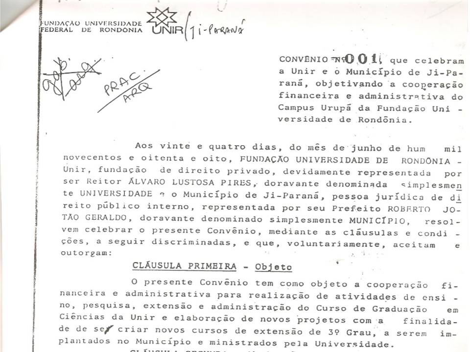 RONDÔNIA. Convênio nº 001. Unir e o município de Ji-Paraná, objetivando a cooperação financeira e administrativa do Campus Urupá da Fundação Universidade de Rondônia. Ji-Paraná: UNIR, junho, 1988.